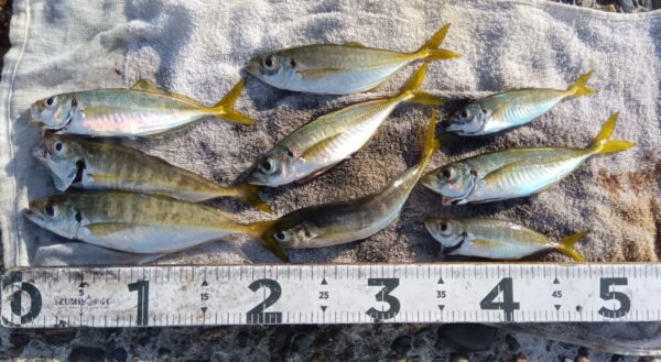 ↓アジ 13~22㎝ 9匹 2番 遠投サビキ ★今日も2番で夕方にアジが釣れていました。