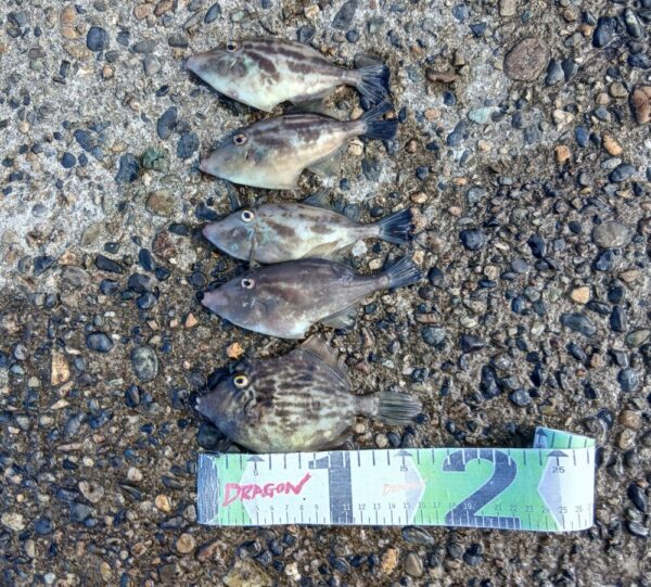 釣果は ワカシ9本、サヨリ80匹、 タチウオ7匹、カワハギ、ウマズラハギ、クロダイ、