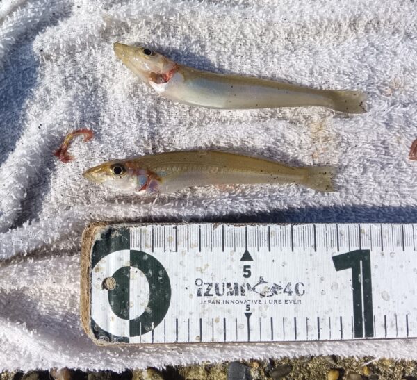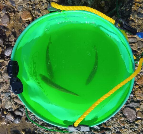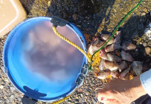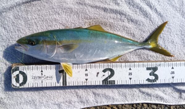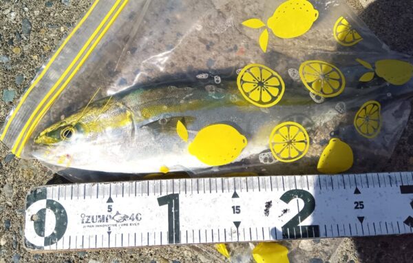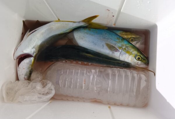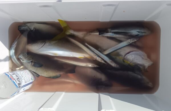 ↓ワカシ2匹、サヨリが20匹位、メジナが4匹入っています。