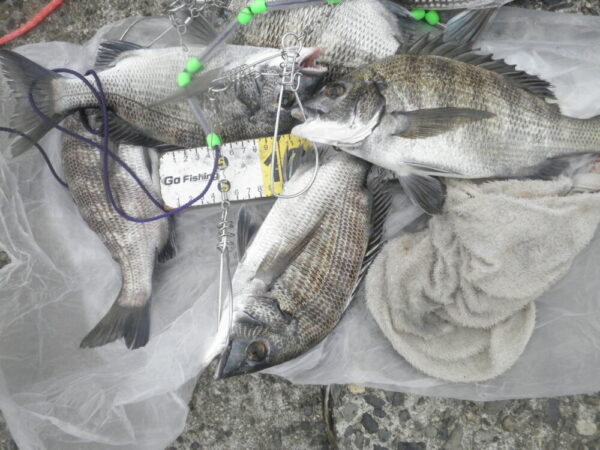 釣り人が多いので ワカシが大漁、久し振りに尺アジが釣れて、クロダイ、メジナ