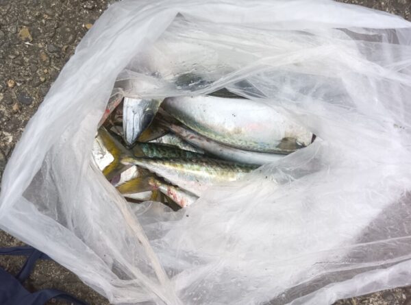 重そうに3袋 持って帰る途中でした。今日一日でサバ30匹以上 サゴシ1匹