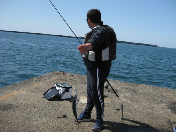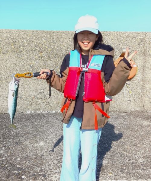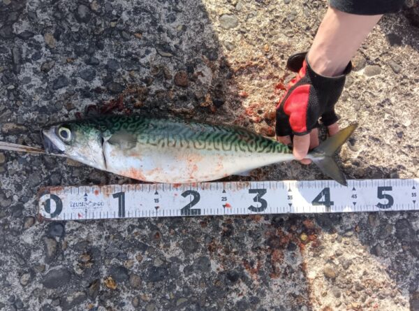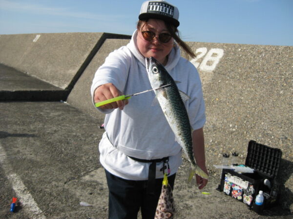 ⇅教えてもらいながら見事にルアーでサバを釣りました。やったね\(^o^)/