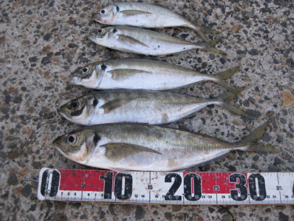 アジ 25~36㎝ 6匹 遠投サビキ 2・3番 夕方に釣れ始めました。