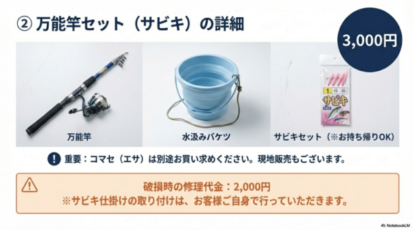 ・万能竿+水汲みバケツ+サビキセット(サビキセットは、持ち帰りOK)