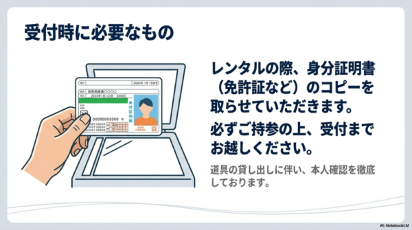 ※レンタルの際に免許証(身分証明書)のコピーを取らせていただきますのでご用意下さい。